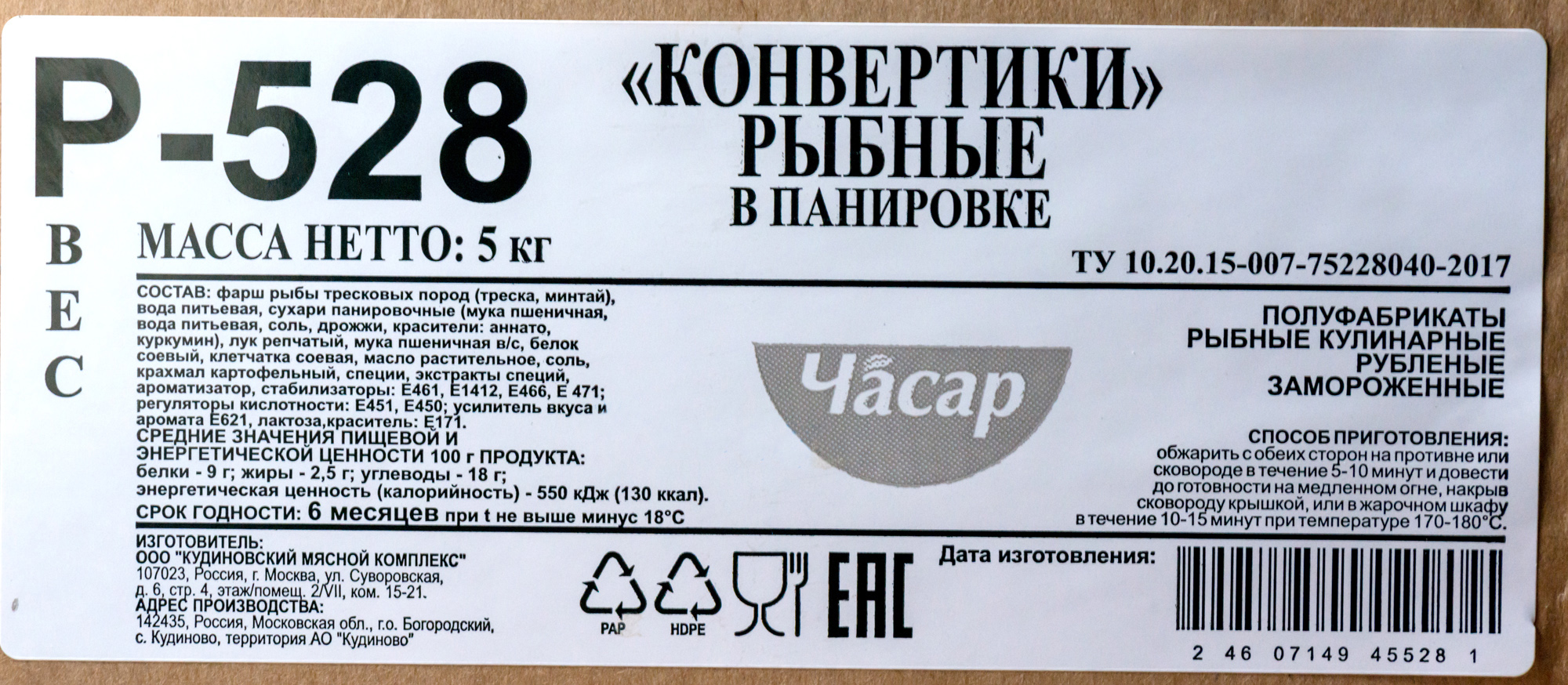 Фарш рыбы тресковых пород (треска, минтай), сухари панировочные (мука пшеничная, вода питьевая, соль, дрожжи, красители: аннато, куркумин), вода питьевая, мука пшеничная, лук репчатый, белок соевый, масло растительное, клетчатка соевая, соль, крахмал картофельный, эмульгатор (метилцеллюлоза, крахмал кукурузный, соль, глюконат натрия, целлюлоза, карбонат натрия), смесь пряностей, ароматизатор, стабилизатор Е450,