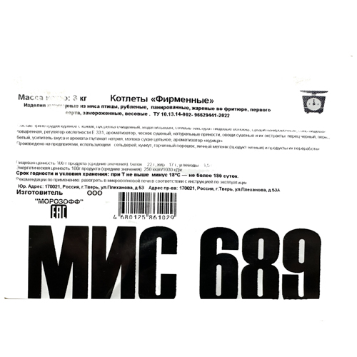 Котлеты Фирменные жареные замороженне /МОРОЗОФФ ТМ/