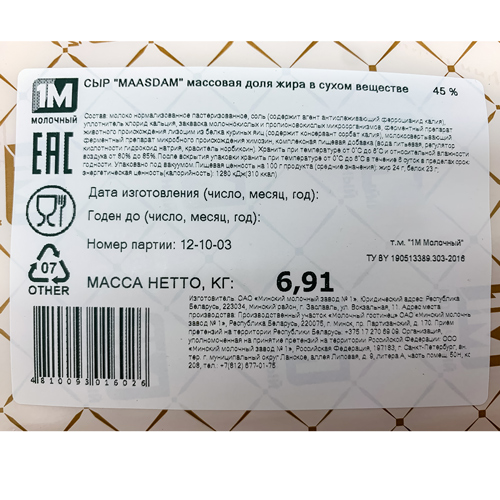 Маасдам сыр 45% брус бзмж /МОЛОЧНЫЙ ГОСТИНЕЦ ТМ/ МИНСКИЙ МК N1